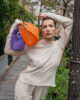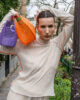Organic cotton jersey t-shirt from the Inimbo cooperative in Chaco, a region in northern Argentina. Ninja cuffs, contrasting embroidered exterior seams and a rolled collar. Phrase in label: “We are what we choose”. Color: Natural with lilac and orange. Sizes: S/M, L/XL. Stock product (see Plazos y envíos).